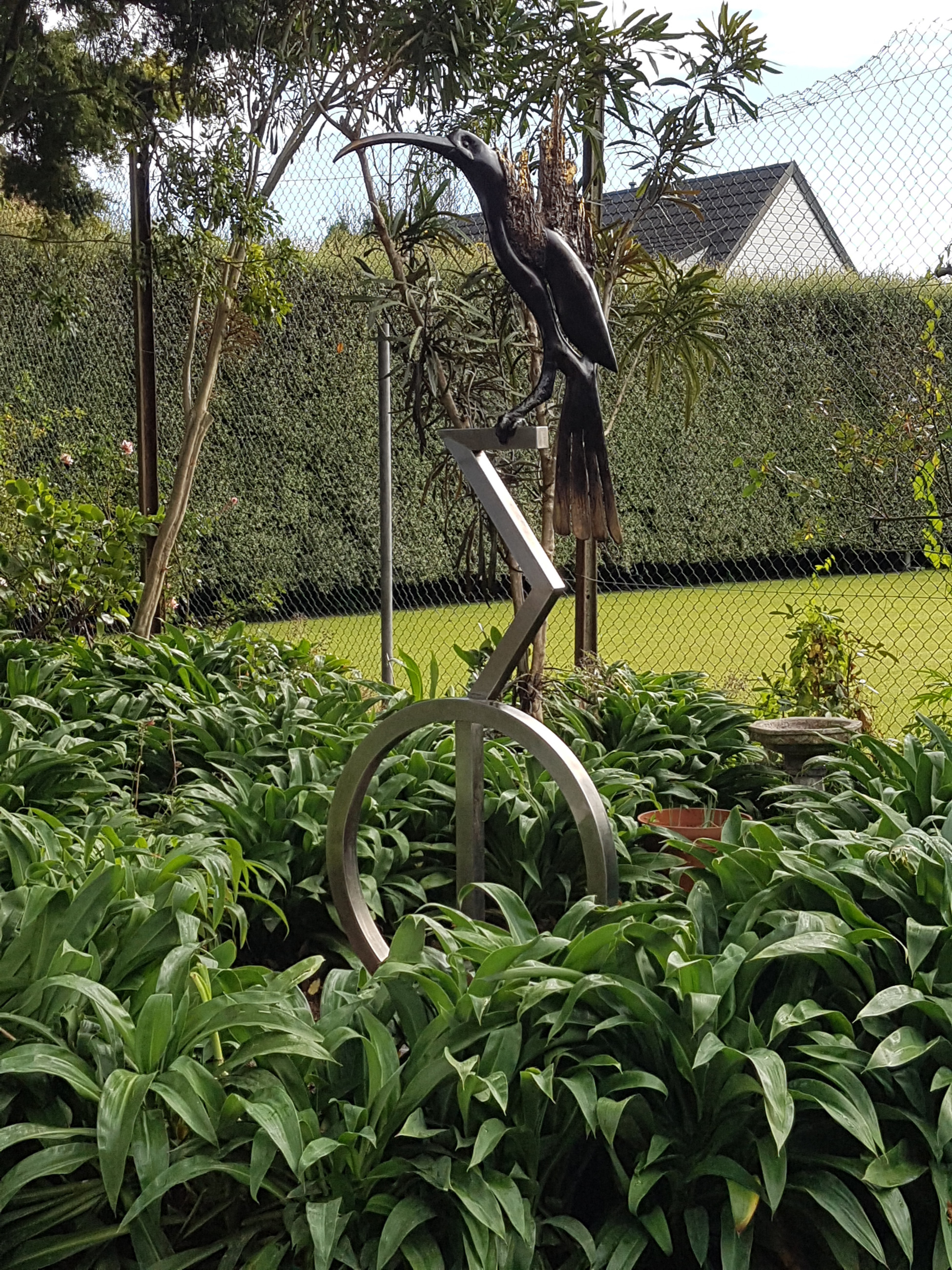 The Huia in the sculpture is perched on a stainless steel stand, forming an elegant juxtaposition of the two materials – the bird sensuously modelled while the stand is fabricated with precise straight angles and a circle.