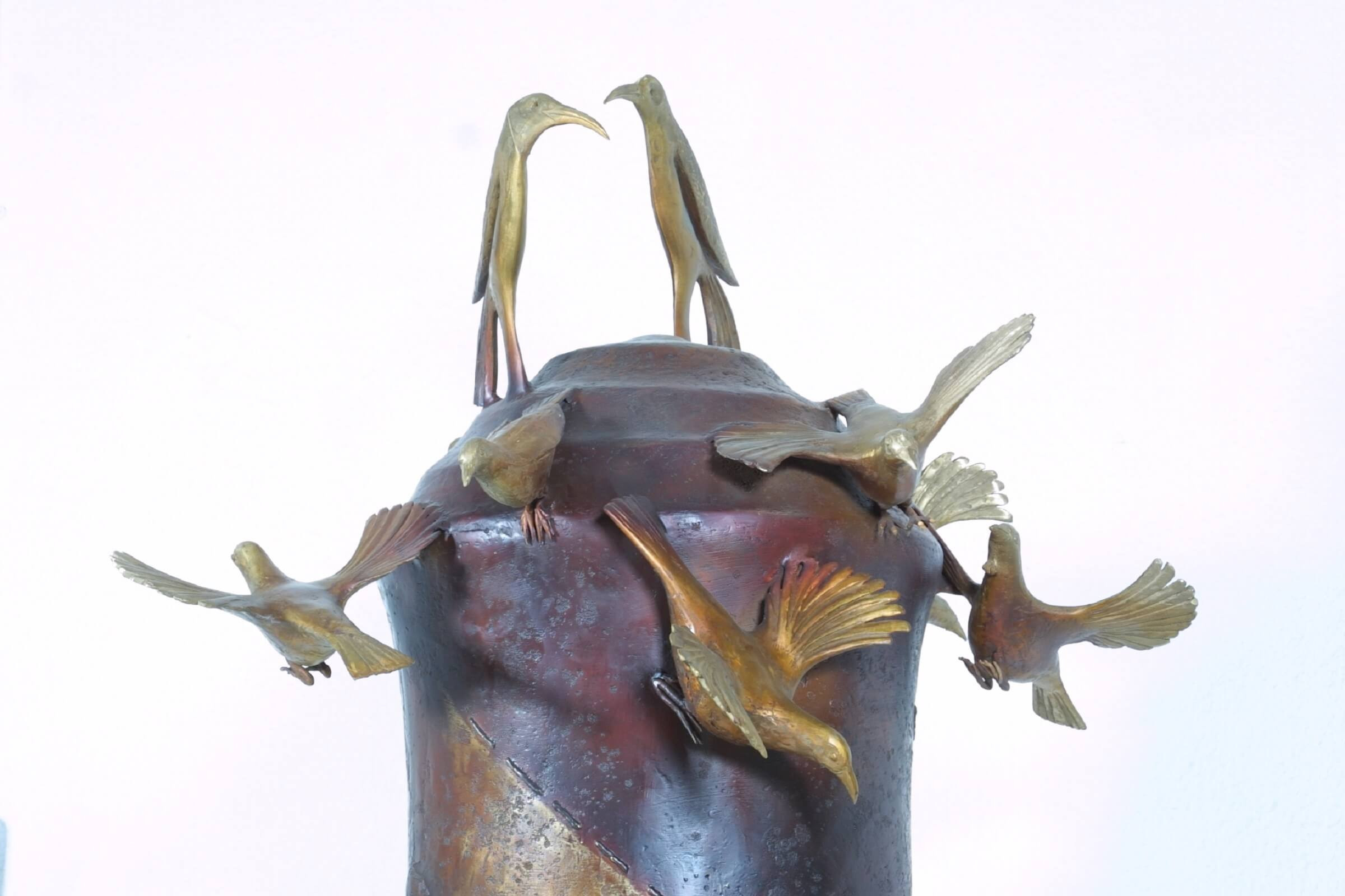 In Nectar Eater’s a massive flax pounder is surrounded by a swirl of birds. Tūī, bellbirds and stitchbirds flutter about the pounder in furious, riotous motion, as if punch drunk on flax berries, their spiralling flightlines tracked on the pounder’s surface. Meanwhile two ancient huia, as still ghosts, perch at the high point of the handle.